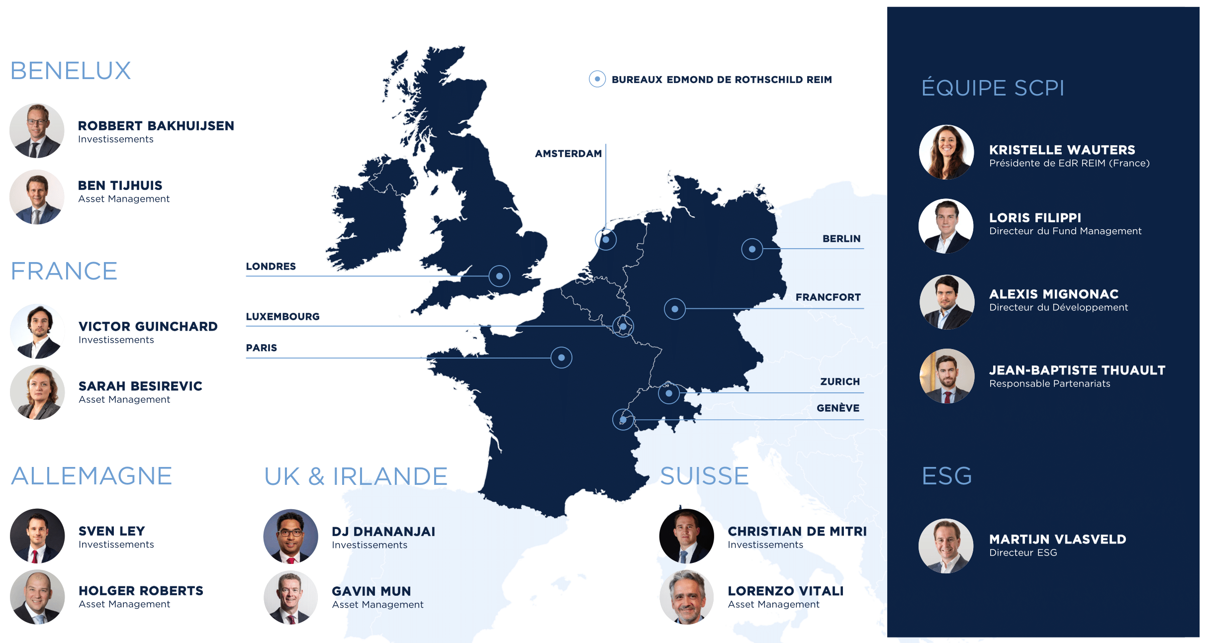Nos équipes sont expertes sur la totalité de la chaîne de valeur et offrent des compétences multisectorielles. Elles ont un ADN de gestion proactive et agile au plus près des actifs et des spécificités locales. Cela permet d’identifier les meilleures opportunités d’investissement. Nos équipes entretiennent en permanence un portefeuille d’opportunités d’investissements à disposition de la SCPI Edmond de Rothschild Europa.
